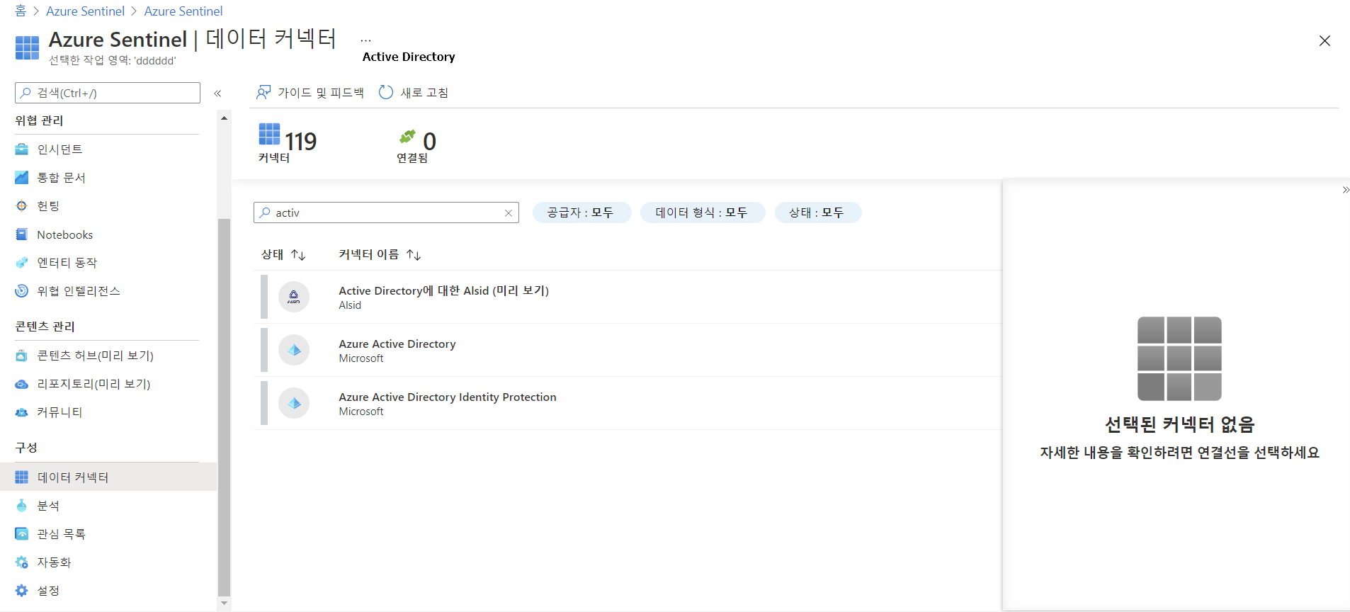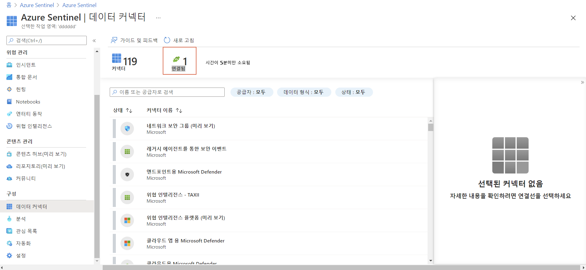 Azure Sentinel을 작업 영역에 온보딩한 후 데이터 원본을 연결하여 데이터를 Azure Sentinel로 수집하여 볼 수 있다.