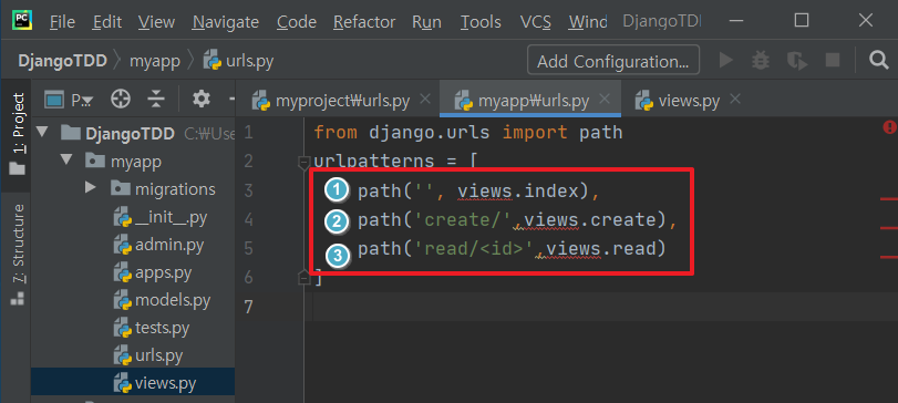 path('',include('myapp.urls')) 입력 후에 myapp에도 urls.py라는 파일을 생성해줍니다.