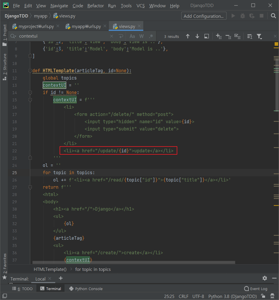 - 라우팅 설정을 하기 위하여, myapp의 urls.py에 update의 path 값을 넣어줍니다.