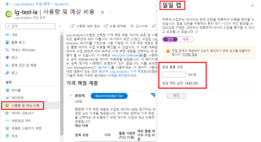 비용이 많이 발생될 것 같아 두렵다면, Log Analytics 작업 영역에서 일일 캡을 설정할 수 있습니다.