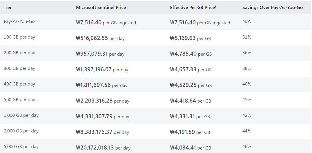 센티넬의 가격 책정은 작업 영역에 수집된 로그 유형을 기반으로 합니다.