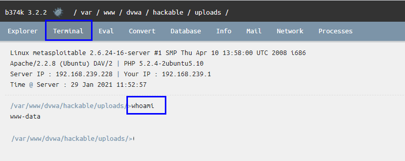 14. 터미널을 이용하여 정보를 얻고, whoami를 입력하여 권한을 확인할 수 있음