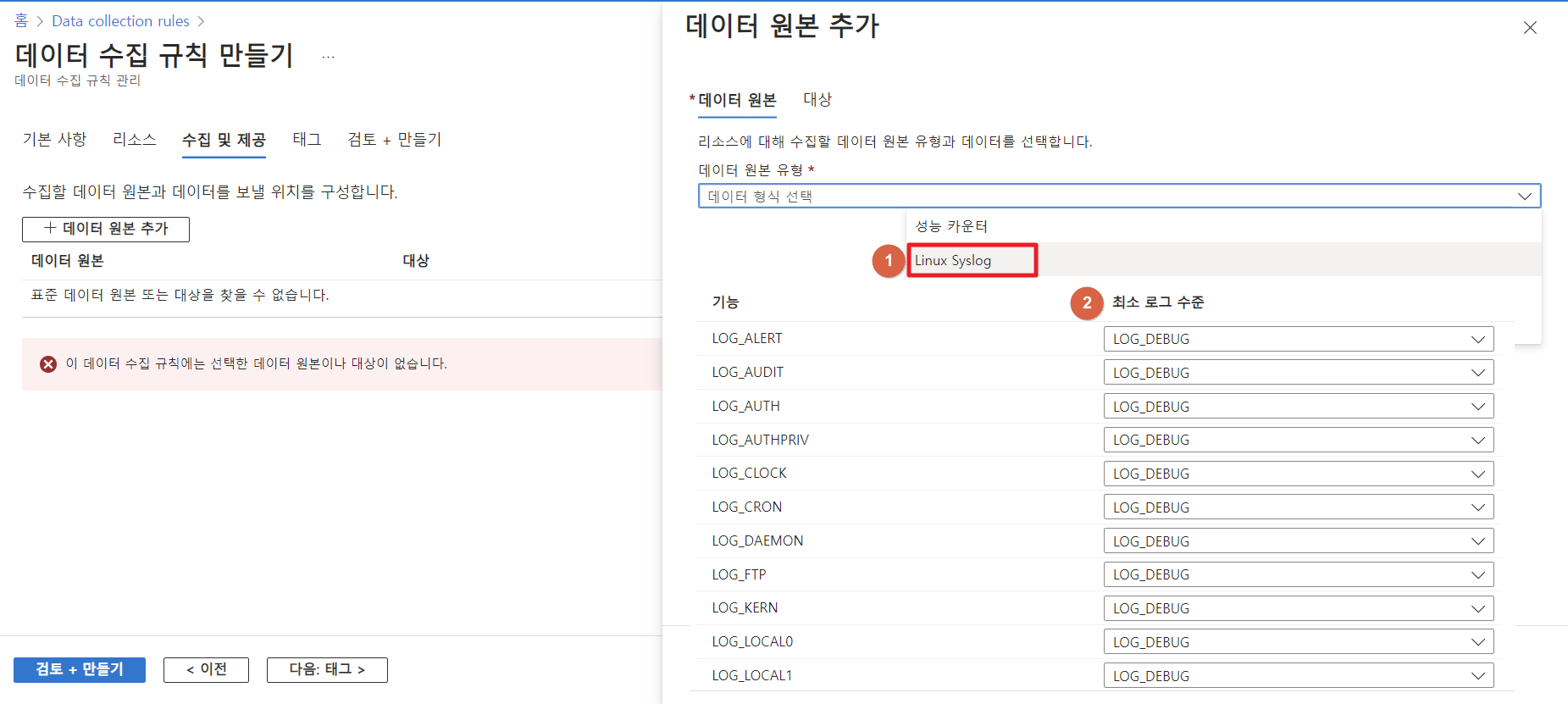 수집 및 제공 탭에서 데이터 원본을 linux syslog로 설정하고, 최소 로그 수준을 설정합니다.