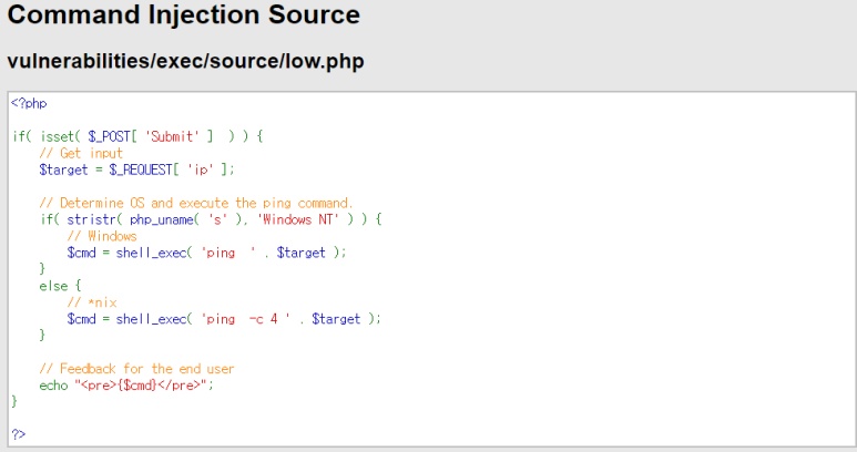 소스코드를 확인해 보면, Submit 버튼 클릭시에 ip 입력에 따라 shell_exec 함수를 통해 커멘드를 실행하여 결과를 표시해 주는 구조입니다.
