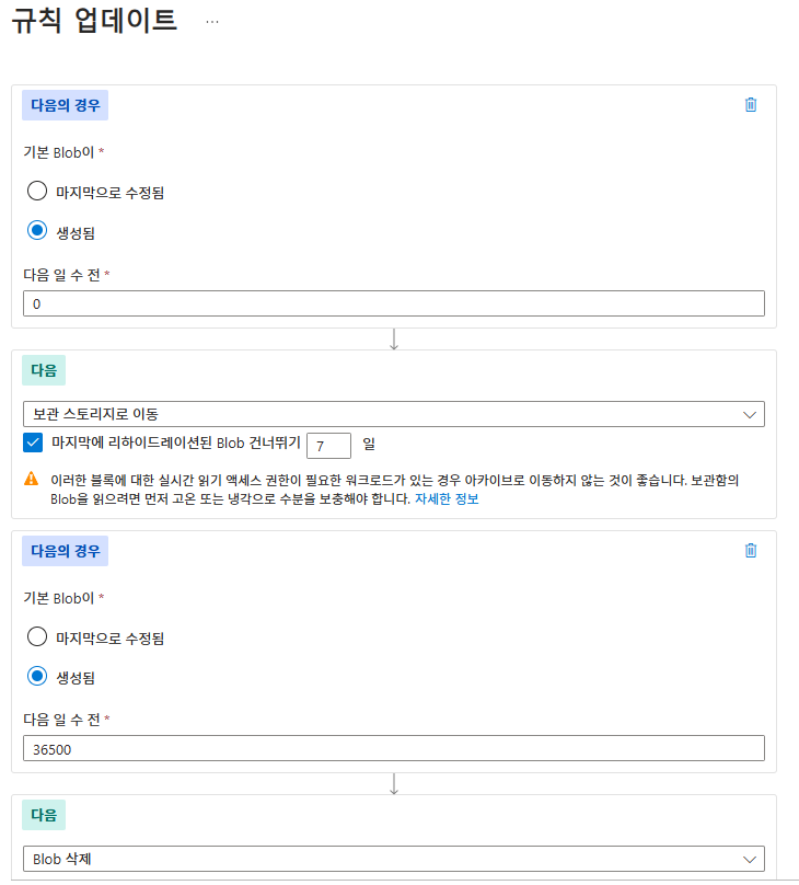 저장 비용을 절감하기 위해 핫, 쿨, 아카이브 계층 간 데이터를 자동으로 이동시킬 수 있습니다.- 예: 처음 6개월은 핫 계층, 이후 6개월은 쿨 계층, 그 이후는 아카이브 계층으로 이동.