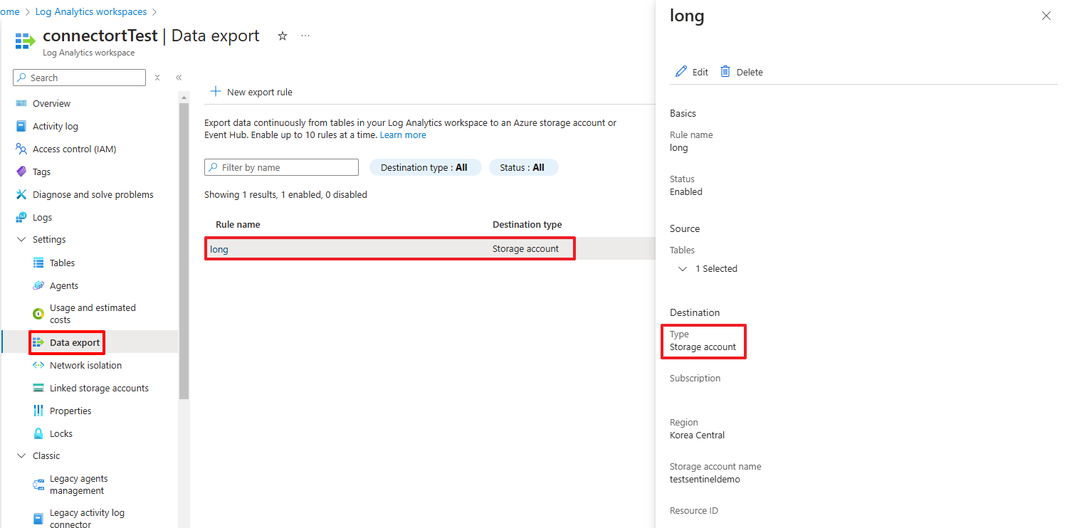 Sentinel과 연동된 Log Analytics에서 데이터 내보내기 규칙을 구성합니다. - Blob Storage 구성: