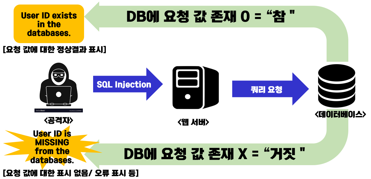 SQL 쿼리 요청에 대한 응답 결과가 참, 거짓에 따라 데이터를 획득하는 공격.