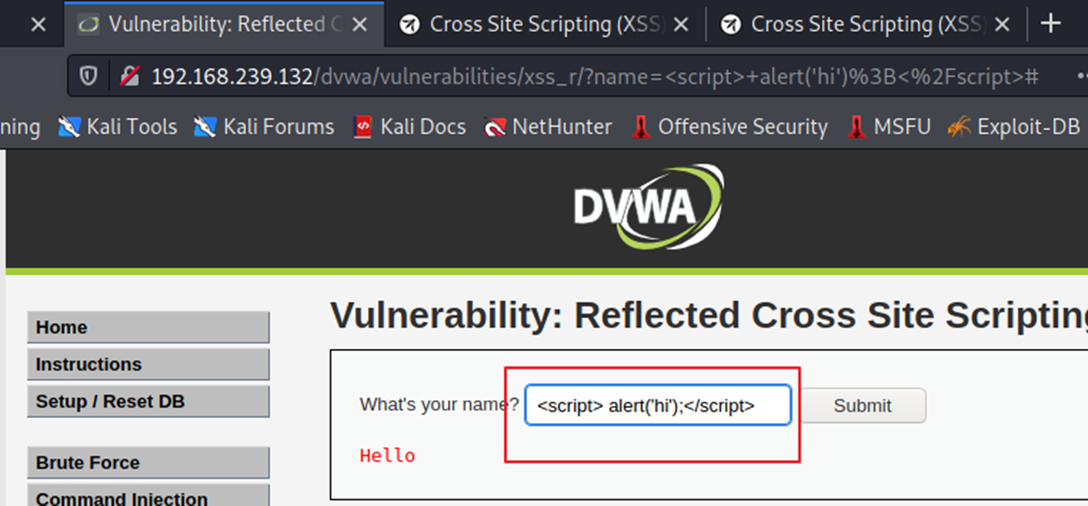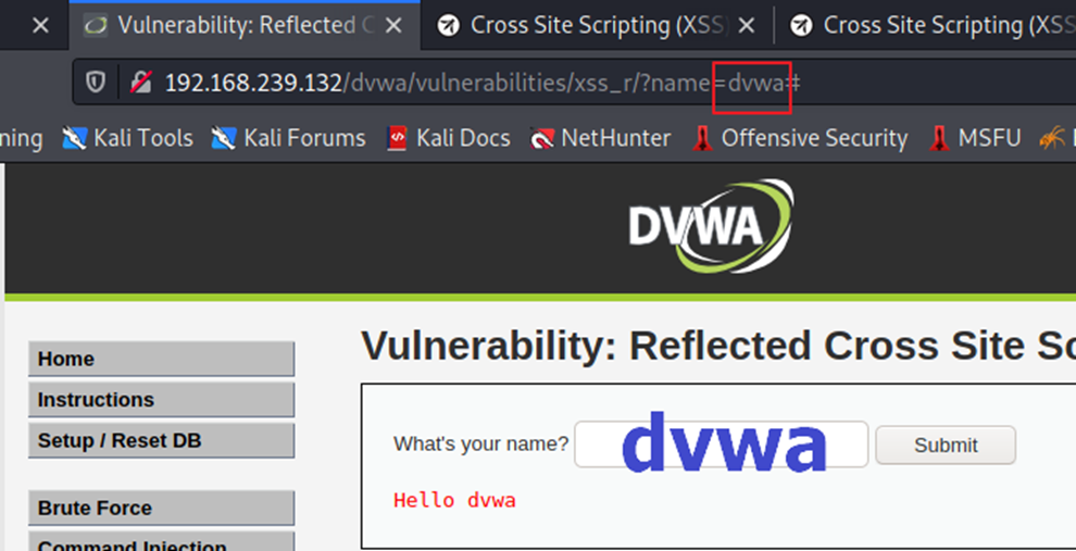 what's your name? 뒤에 dvwa를 넣게 되면 주소창에 dvwa가 그대로 출력됩니다.